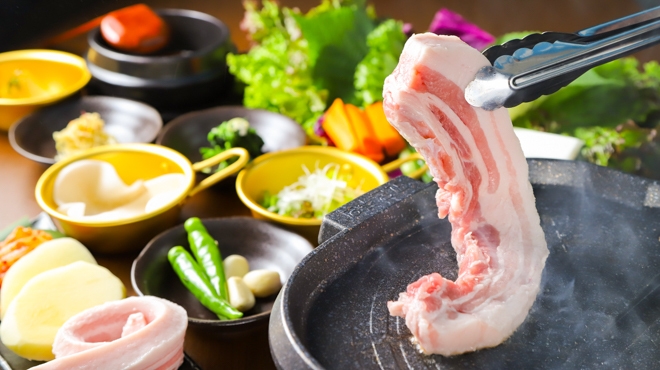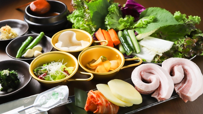 素材にこだわり、熟練のシェフが手掛ける高級韓国料理のお店です。特におすすめなのが、8種の旬野菜・日替わりおかず・お肉が付いたヘルシーなサンパセット。お肉は、鹿児島県産の生豚肉を使用したサムギョプサルなどからお選びいただけます。ほか、タンスユックやジャージャン麺など韓国風中華料理もぜひお試しください。モダンで落ち着いた雰囲気の店内にはテーブル席のほか掘りごたつもあり、ゆったりとお過ごしいただけます。